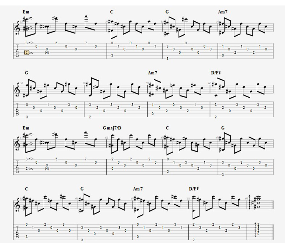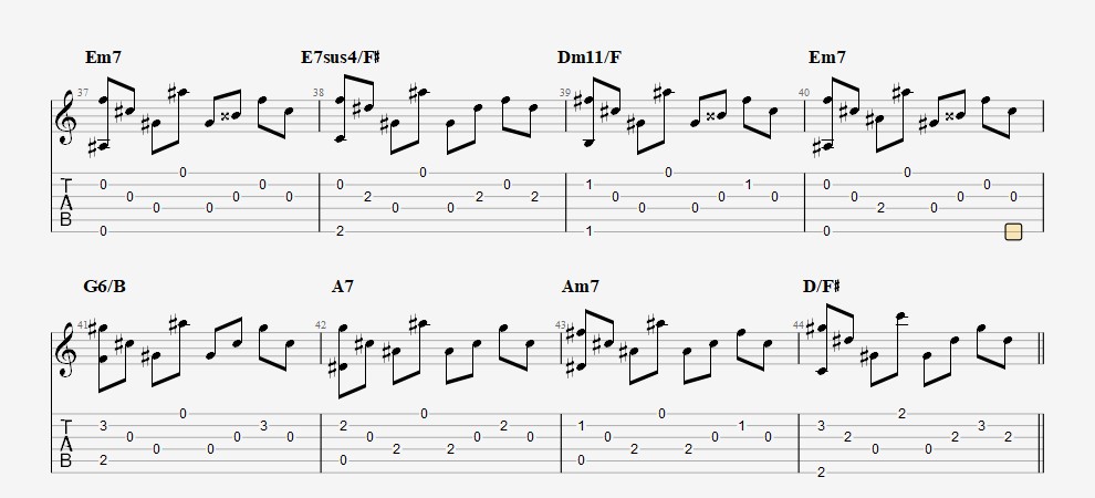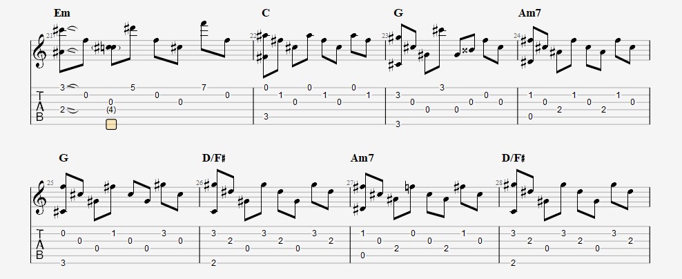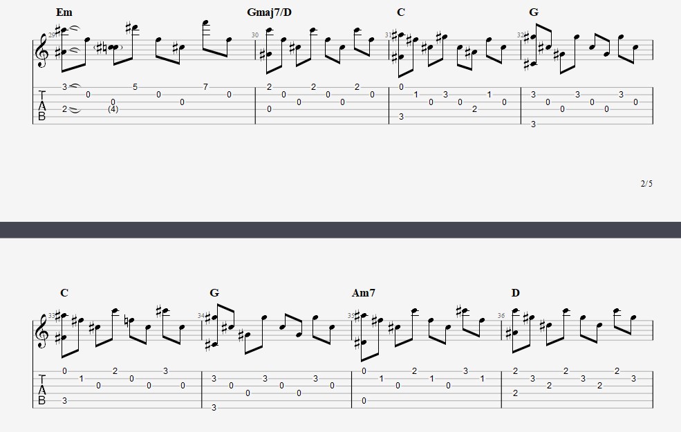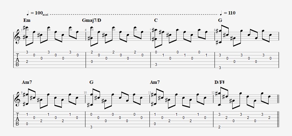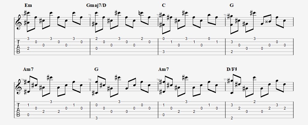Changez d’accord et recommencez: P+a, m, i, a, m, i, a, m etc…Bien!, maintenant faites la même chose, mais à la place des cordes mi, si et sol, montez d’un cran et jouez les cordes de si, sol et ré en gardant le même arpège. Là est une partie du secret de ce morceau.