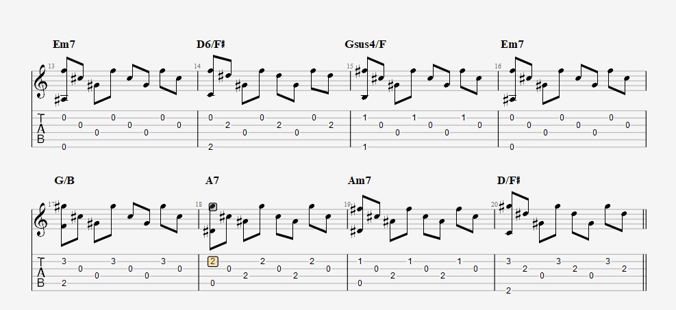 Sur les trois premières mesures on démarre sur la corde de Mi puis à la 4eme mesure, on passe à l’arpège, à partir de la corde de Si, d’où l’utilité de l’exercice de la partie 01.