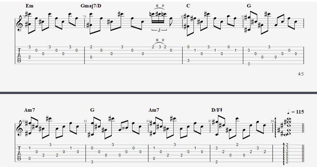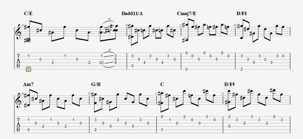 Sur la mesure 1 (45) on remarque un Slide et une position C/E. Si on regarde bien, c’est une position de La mineur 7, maintenant bien connue, cependant on n’utilise pas la fondamentale de LA mais un renversement de la quinte sur le MI grave.